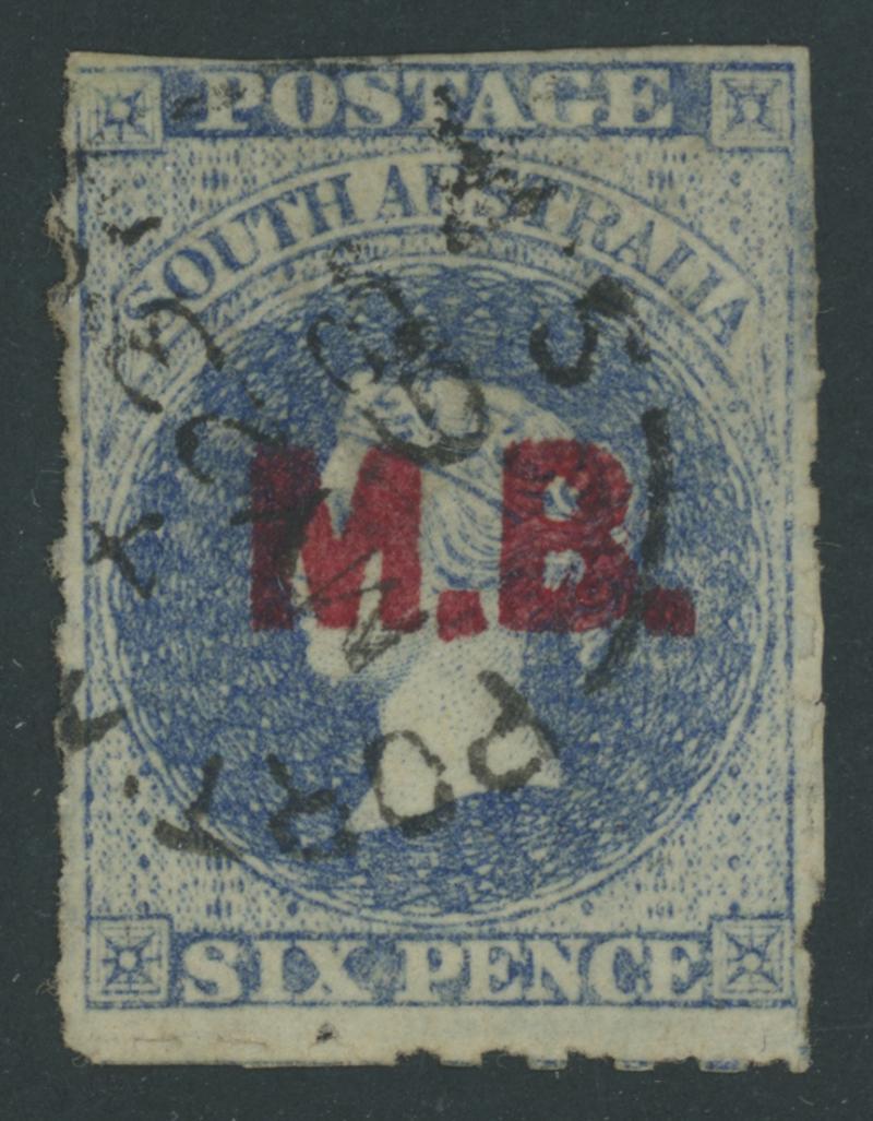 RED OVERPRINT: 'M.B.' on QV Perkins Bacon Large Star Wmk Rouletted 6d dull ultramarine SG DO334, rouletting except at the top where cut from the sheet to preserve the design, Port Adelaide cds of 'MY23/68', Cat £130. Rated R. Don Pearce's superb example sold for $179 (Sale 247 Lot 495). [Date range 23.5.1868 to 23.5.1869] (Image1)