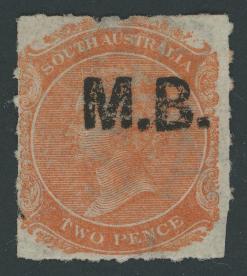 BLACK OVERPRINT: 'M.B.' on QV De La Rue Large Star Wmk Rouletted 2d red-orange SG DO338a, rouletting on all sides, Port Adelaide cds with indistinct date, Cat £250. Rated RRR; unrecorded unused. Ex Keith Harrison: sold for $1165 (Sale 183 Lot 516). RPSV Certificate (2013). Superior to Don Pearce's example - small defects - that sold for $323 (Sale 247 Lot 503). [Date range -.10.1870 to 26.7.1871] (Image1)