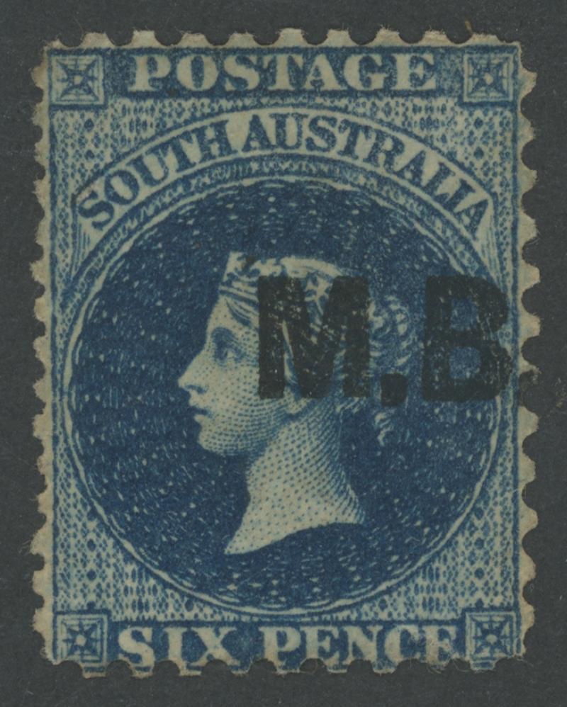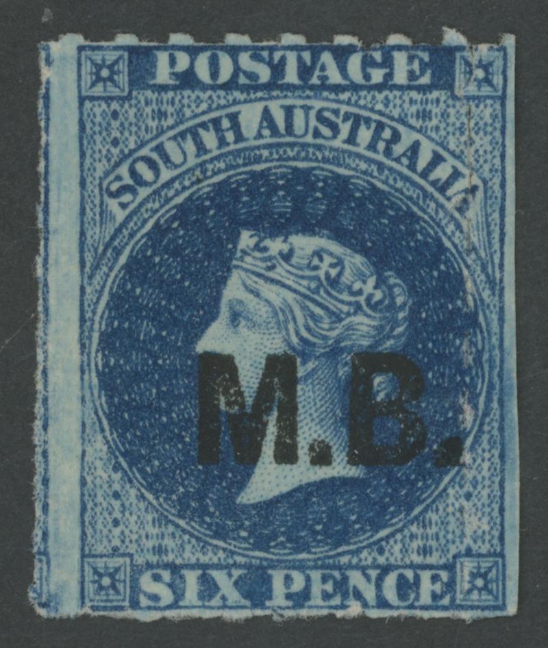 BLACK OVERPRINT: 'M.B.' on QV Perkins Bacon Large Star Wmk Regular Compound Perf 11½-12½x10 6d Prussian blue SG DO351, misplaced perforations resulting in a huge stamp with parts of three adjoining units and including 'SIX PENCE' at Top & Base, light Port Adelaide cds with indistinct date, Cat £100. Rated R; unrecorded unused. Magnificent. Don Pearce's regular-size example sold for $167 (Sale 247 Lot 515). [Date range 2.7.1872 to 31.5.1874] (Image1)