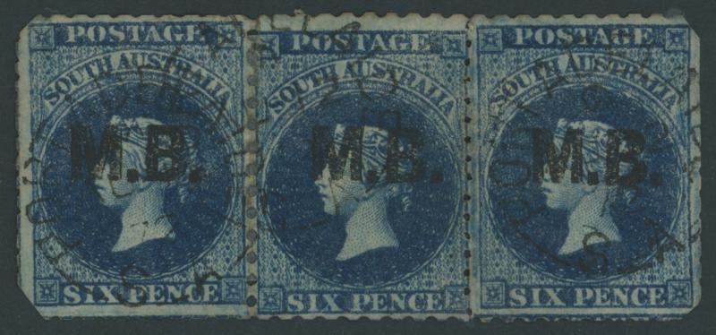 BLACK OVERPRINT: 'M.B.' on QV Perkins Bacon Large Star Wmk Perf 11½-12½ 6d Prussian blue SG DO345 horizontal strip of 3, the central unit very fine the others with clipped outer corners & some trimmed perfs, some split/reinforced perfs between the first two units, fine Port Adelaide cds of 'AU12/72', Cat £675+. Rated RRR+; unrecorded unused. A rare multiple. Ex Lord Samuel Vestey - sold for £360 - and David Pitts (in a group lot). Absent from 'Besancon' and Don Pearce but his superb single in bright blue and pair in dull blue sold for $359 & $1135 respectively (Sale 247 Lots 511 & 512). (Image1)