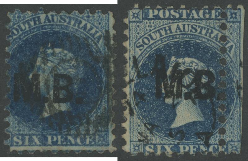 BLACK OVERPRINT: 'M.B.' on QV Perkins Bacon Large Star Wmk Perf 10 6d Prussian blue SG DO348, a small example with regular perfs & circle-in-bars cancel, and a larger example with misplaced perfs at right & cut from the sheet to preserve the design & Port Adelaide cds of 'JA2-/75', Cat £260. Rated RRR. Don Pearce's very fine single sold for $227 (Sale 247 Lot 514). [Date range 20.7.1871 to 2-.1.1875] (2) (Image1)