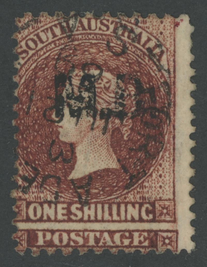 BLACK OVERPRINT: 'M.B.' on QV Perkins Bacon Large Star Wmk with Irregular Compound Perf 11½-12½x10x10x10 1/- bright red-brown on brownish tinted paper SG DO352, Port Adelaide cds of 'DE3/72', Cat £950. Rated RRR; unrecorded unused. Ex David Pitts (in a group lot). Chris Ceremuga Certificate (2019) states "very rare". Don Pearce's superb variant sold for $1615 (Sale 247 Lot 518). Absent from 'Besancon'. [Date range across all variants 20.5.1872 to 3.12.1872 only] (Image1)