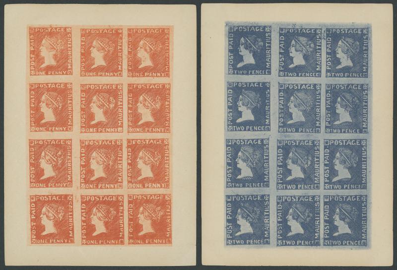 FORGERIES: 1847 'POST OFFICE' 1d x5 & 2d x5 plus with 'Fac-simile' Overprint x5; 1848 'POST PAID' 1d x6 & 2d x6 with 'Fac-simile' Overprint x9 plus 'autotype' complete sheetlets of 12 (3x4) of the 1d x8 (one with the outer margins removed) and 2d x5, these with some minor peripheral damage not affecting the impressions. Rarely available in such quantity.