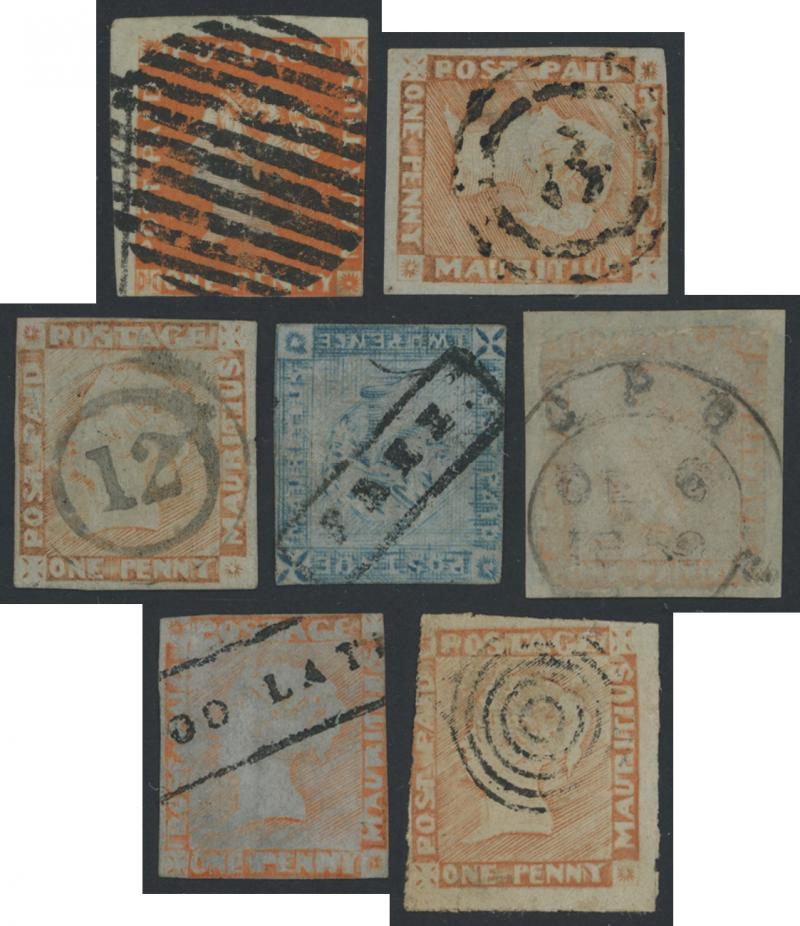 POSTMARKS: Display pages with superb 12-bar obliterator, 'target' cancel x7 (four of Mare d'Albert), Double-Ring Numerals '1' to '16' complete ('11' & '15' have not been recorded), Triple-Ring Numerals '1' x3 & '2' in blue x2, double-circle 'G P O/DE 6/1850', boxed 'FREE' x2 & superb '[T]OO LAT[E]', the stamps include 'POST PAID' 1d x6 (all defective/repaired) & several other Imperfs, most of the strikes are fine to very fine.