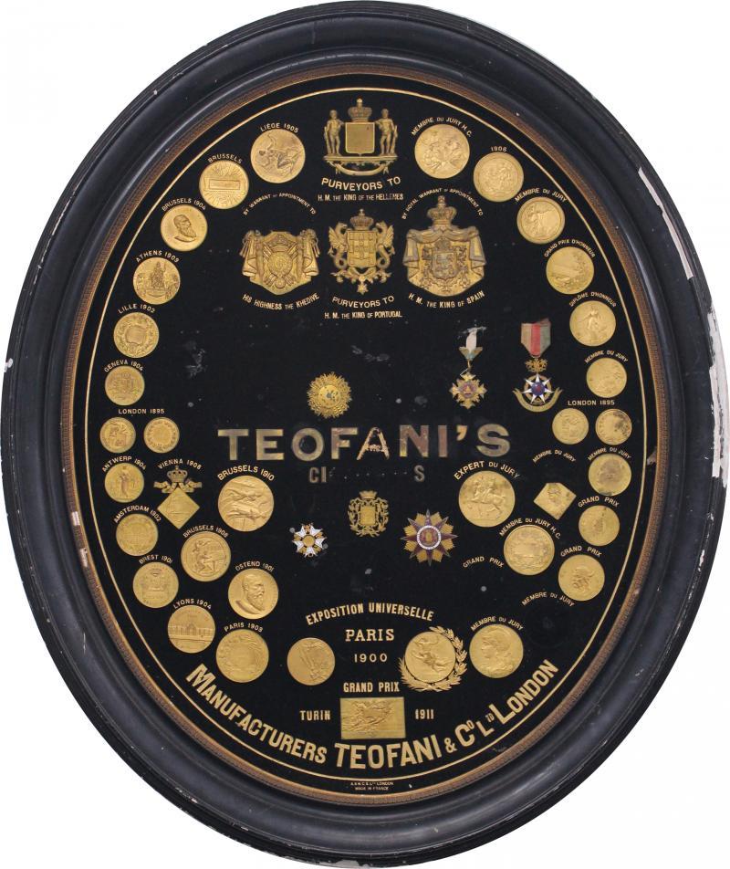 Teofani & Co Ltd London cigarette manufacturers and importers large oval display (920mm x 1100mm) showing 1900-1911 Royal Warrants and replica Exhibition awards, a few are the original medals, five or six missing plus some text, in need of some TLC, nonetheless an impressive tobacco enthusiasts display. Delicate, to be picked up. (Image1)