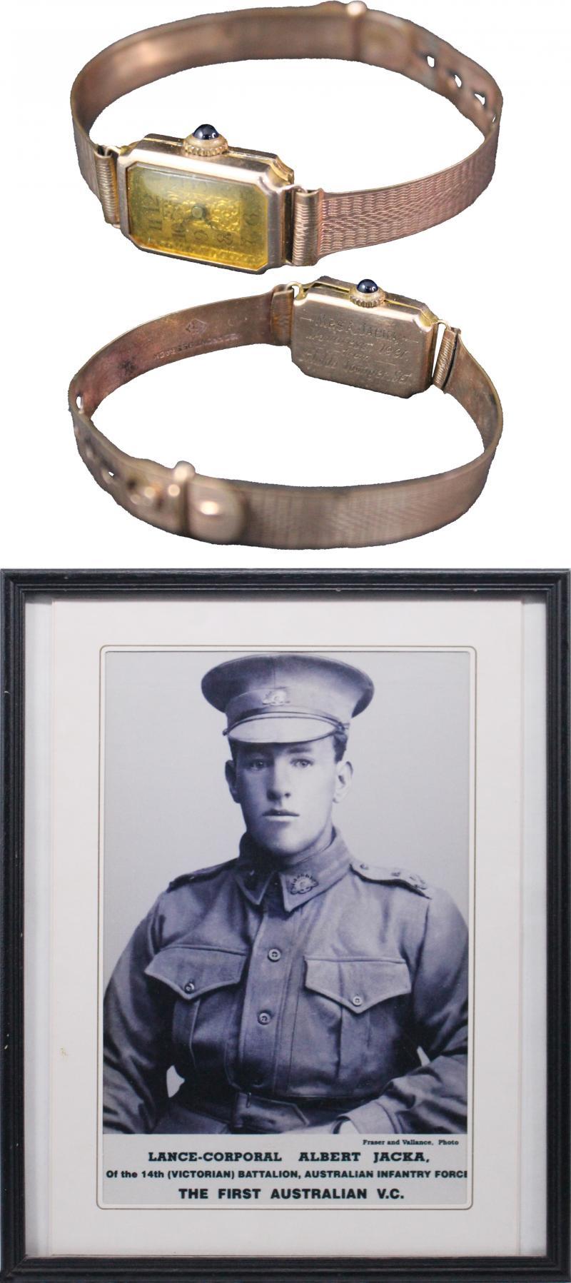 ALBERT JACKA VC: Collection including 9ct gold Ladies watch engraved on reverse "MRS A JACKA, Mayoress 1931, from St Kilda Younger Set"; books (5) including 'Jacka's Mob' by Rule [Sydney, 1938]; photograph, medallion, postcard, PO Pack; press clippings, mainly Fair/Fine.