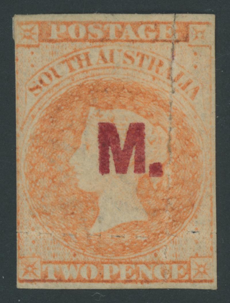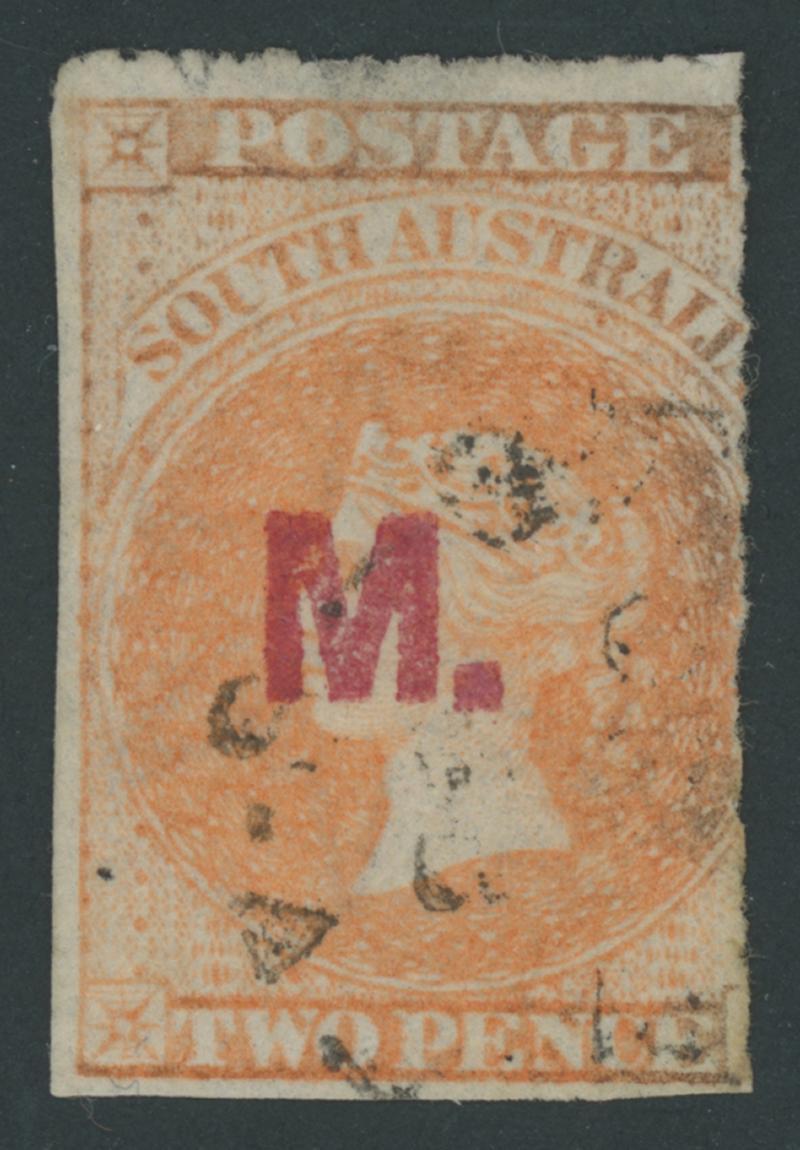 RED OVERPRINT: 'M.' on QV Perkins Bacon Large Star Wmk Rouletted 2d pale vermilion SG DO325, Grossly Misplaced Rouletting 4mm into the Design at Right & Base so cut from the sheet to preserve the design, the vertical roulettes partly separated & reinforced, large-part gum, Cat £600. Rated RRRR. Ex William Frazer. Lord Vestey's very fine example sold for £360. The 'Besancon' example - shaved at top & truncated at the base - sold for SFr605. Absent from Don Pearce's collection. (Image1)