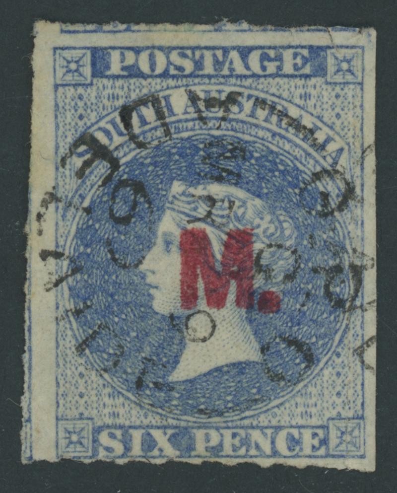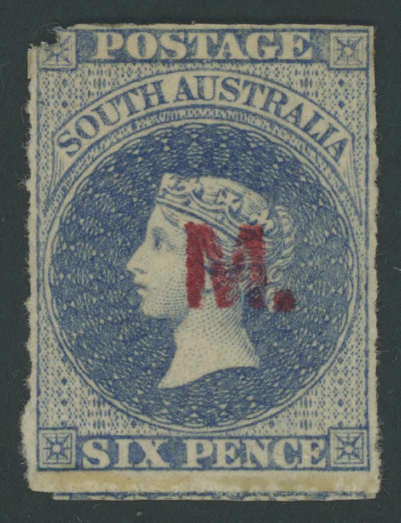 RED OVERPRINT: 'M.' on QV Perkins Bacon Large Star Wmk Rouletted 6d dull ultramarine SG DO326, remarkably with rouletting clear of the design on all sides, small separation fault at upper-left, large-part gum, Cat £500. Rated RRRR. Ex Baron von Ferrary, Ernest Lye and Colonel Napier (II). Chris Ceremuga Certificate (2004) states "very rare". Rodney Attwood's similar example sold for $1050 (Sale 168 Lot 409). Absent from Don Pearce's collection. (Image1)