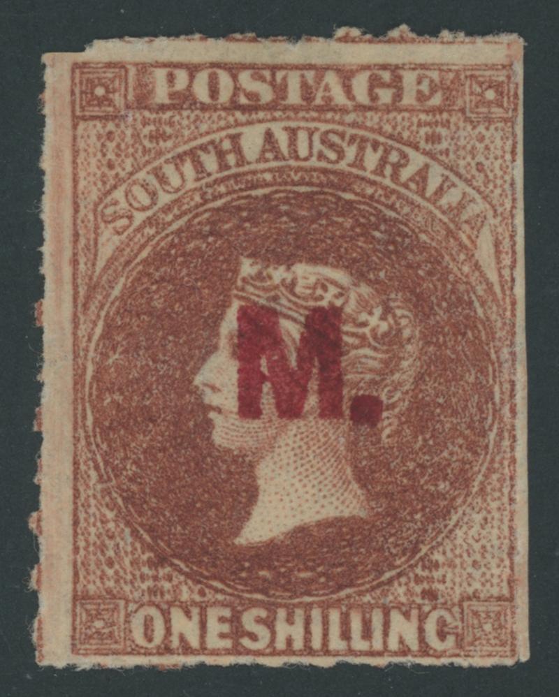 BLACK OVERPRINT: 'M.' on QV Perkins Bacon Large Star Wmk Perf 11½-12½xRouletted 1/- red-brown SG DO330, misplaced rouletting at left so cut from the sheet well clear of the design, closed 10mm tear at upper-right doesn't detract from the very fine facial appearance, unused, Cat £1700. Unrecorded unused by Ron Butler and we have recorded only two other examples so it should be rated RRRRR. Ex Baron von Ferrary, Theodore Champion and Philip Croker. Chris Ceremuga Certificate (2009) states "extremely rare" but does not mention the tear. The very fine Vestey and 'Besancon' examples sold for £1320 and SFr2175 respectively. (Image1)
