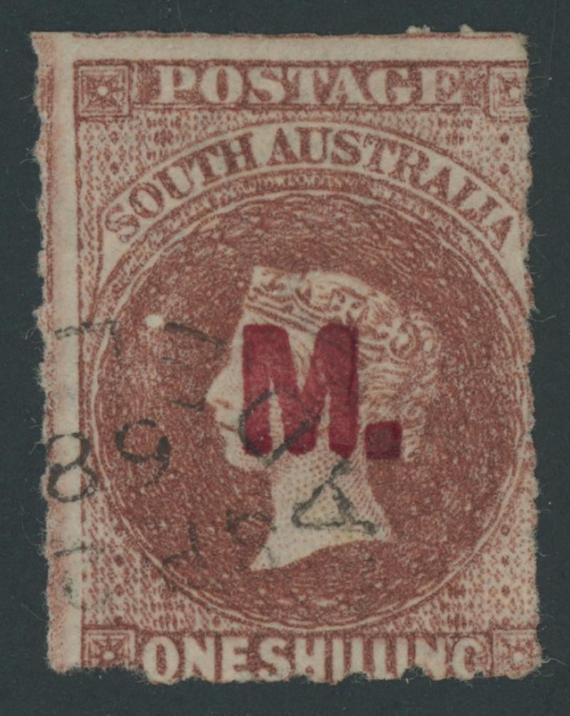 RED OVERPRINT: 'M.' on QV Perkins Bacon Large Star Wmk Rouletted 1/- bright red-brown SG DO327, rouletting on all sides, small separation fault at lower-left, light GPO cds of 'SP2-/68', Cat £400. Rated RRRR. Don Pearce's very fine example sold for $715 (Sale 247 Lot 523). [Date range 20.4.1868 to 24.7.1869] (Image1)