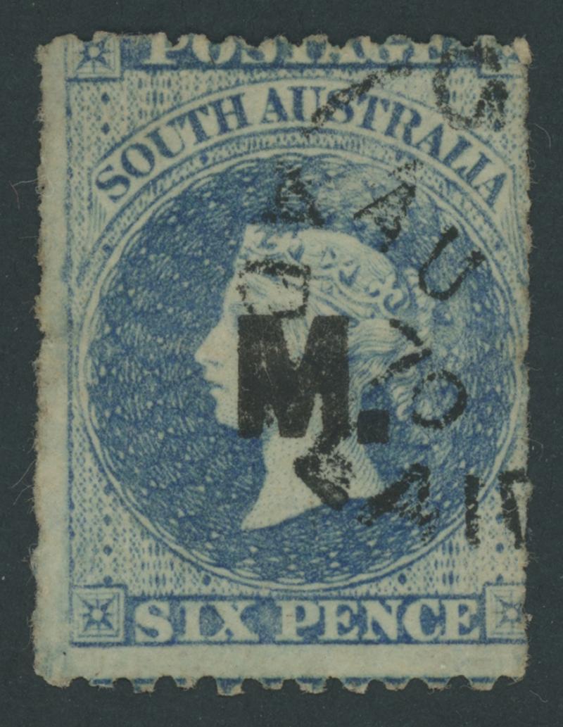 BLACK OVERPRINT: 'M.' on QV Perkins Bacon Large Star Wmk Perf 11½-12½xRouletted 6d bright pale blue SG DO329, light ironed-out crease at lower-left, fine GPO cds of 'AU--/70', Cat £1200. Rated RRRRR. Ex Hugh Wynn and 'Tamiami': sold for $3595 (Sale 336 Lot 657). Don Pearce's very fine example was very inexpensive at $900 (Sale 247 Lot 524). Absent from 'Besancon'. [Date range 20.4.1870 to -.8.1870 only] (Image1)