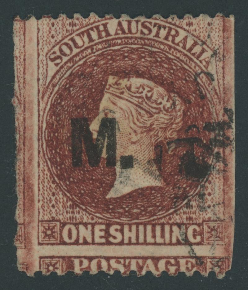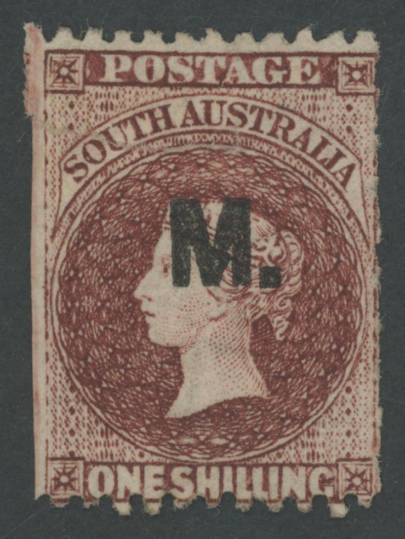 BLACK OVERPRINT: 'M.' on QV Perkins Bacon Large Star Wmk Perf 11½-12½xRouletted 1/- red-brown on brownish tinted paper SG DO330, Misplaced Perforations resulting in 'POSTAGE' at the Base and Misplaced Roulettes so cut from the sheet to preserve the design at right, a couple of minor tonespots on the reverse, indistinct cancel. Rated RRRR. Ex EB Lye, Colonel Napier (I) and Don Pearce: sold for $455 (Sale 247 Lot 525). RPSL Certificate (1965). The similar 'Tamiami' example sold for $347. Absent from 'Besancon'. [Date range 12.10.1869 to -.8.1870] (Image1)