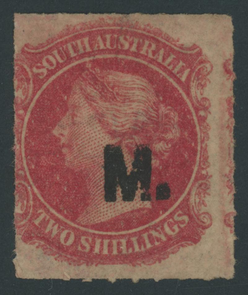 BLACK OVERPRINT: 'M.' on QV Perkins Bacon Large Star Wmk Rouletted 2/- rose-carmine SG DO328, rouletting on all sides, minor characteristic staining from the brown ('black-boy') gum, unused, Cat £800. Rated RRRR. More attractive than Don Pearce's mint example - small separation faults - that sold for $1435 (Sale 247 Lot 526). (Image1)