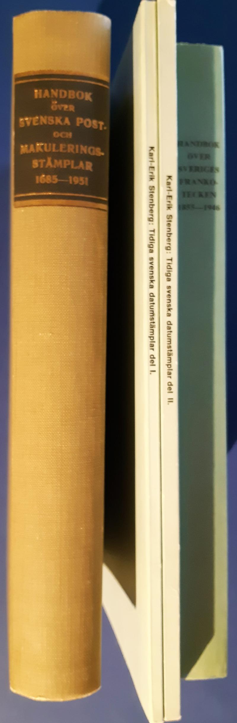 Sweden, Handbooks. 'Handbok över Sveriges frankotecken 1855–1946' (SFF), 'Handbok över svenska post- och makuleringsstämplar 1685–1951' (SFF) and 'Tidiga svenska datumstämplar' part I and part II (SFF). All used. (4) 1 more image is available at www.philea.se. (Image1)