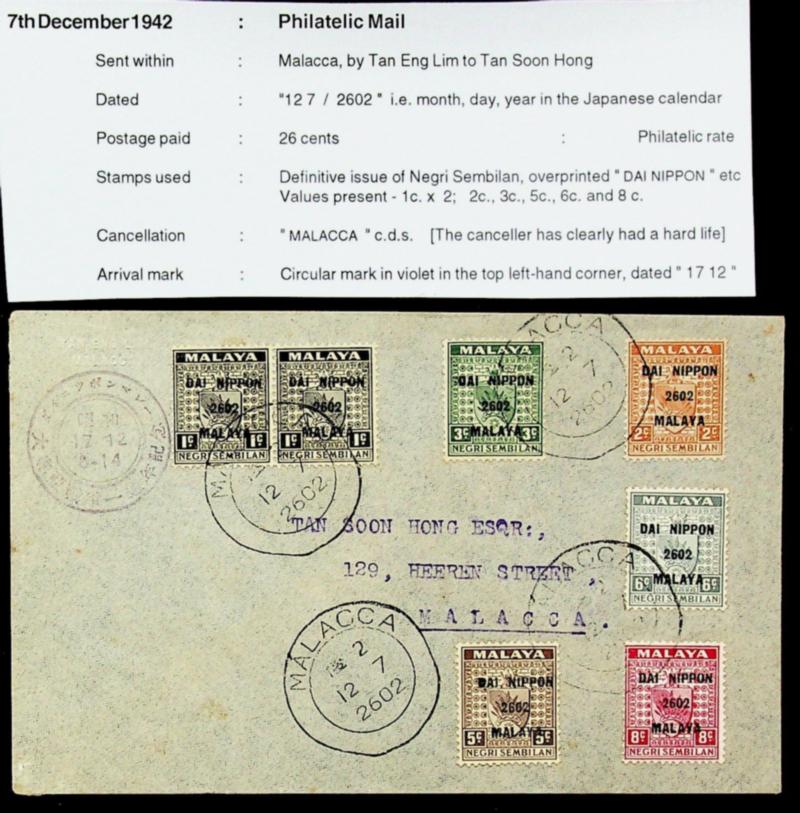 Malaya Japanese occupation 1942 WWII Negri Sembilan 7v w/ "Dai Nippon/ 2602" ovpt on cover sent within Malacca (Image)