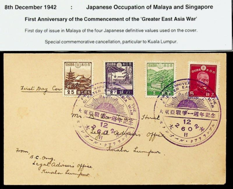 Malaya Singapore Japanese occupation 1942 WWII 1st Anniversary of Commencement of Greater East Asia War 4v FDC to Kuala Lumpur (Image)