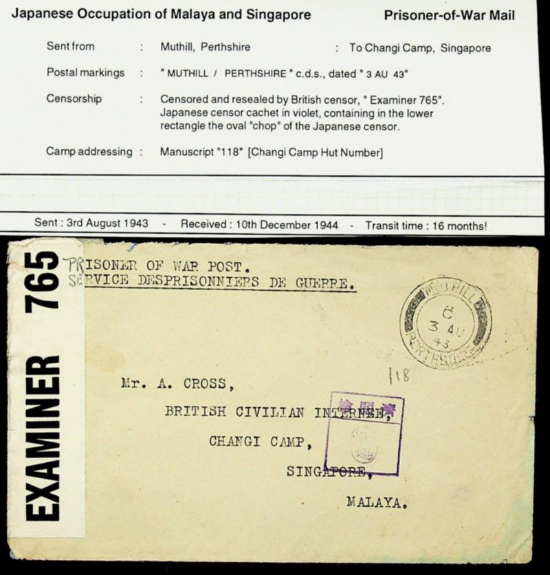 GB Scotland 1943 WWII Prisoner of War censored cover from Muthill Perthshire to Changi Camp Singapore Malaya Japanese occupation (Image)