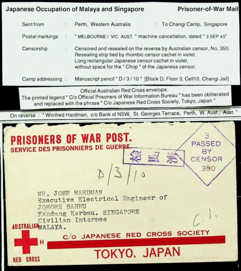 Australia 1943 WWII Red Cross Prisoner of War censored cover from Melbourne VIc. to Changi Camp Singapore Malaya Japanese occupation (Image)