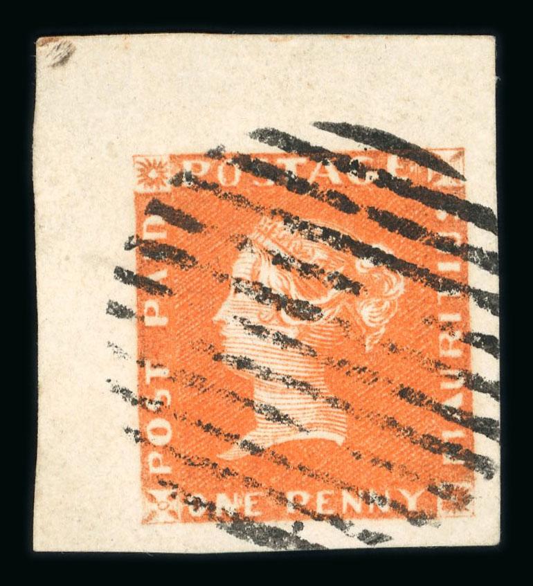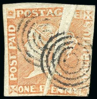 1d orange-vermilion on yellowish paper, earliest impression, pos.1 with sheet corner margin and very large margins on the other two sides, neatly cancelled by barred circle, superb impression and vivid colour, the finest known single of the rare earliest impression, unique in this condition and one of the most iconic items of the entire Post Paid issue; cert. BPA 1987) and RPS (1988) (S.G. £18'000 for a regular stamp). (Image)