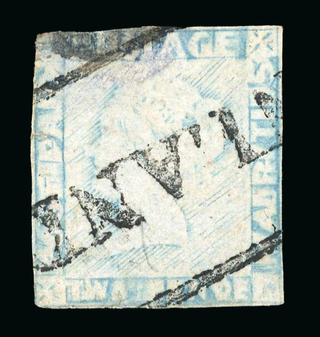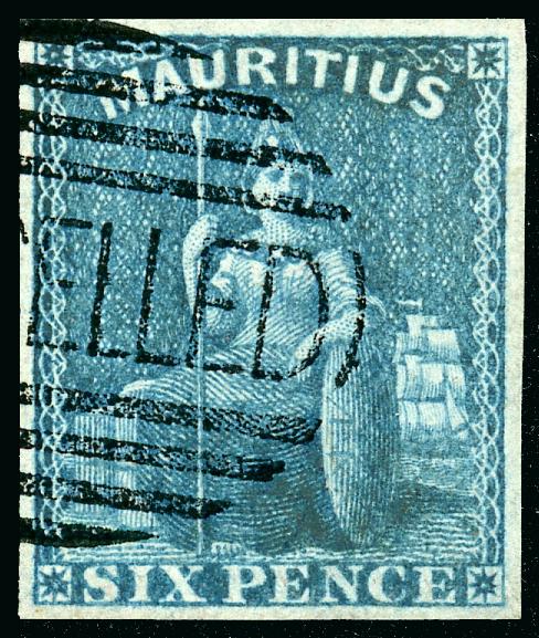 2d blue, Lapirot issue, early impression (pos. 10), neatly cancelled by numeral 16 of Rivière Sèche; numeral obliterator on the Lapirot issue is very rare; a very attractive stamp with very wide margins (quite similar to Kanai lot 162), with BPA certificate 1996 (noting a central surface fault which is due to a tiny surface abrasion from the "sticky" postmark). (Image)