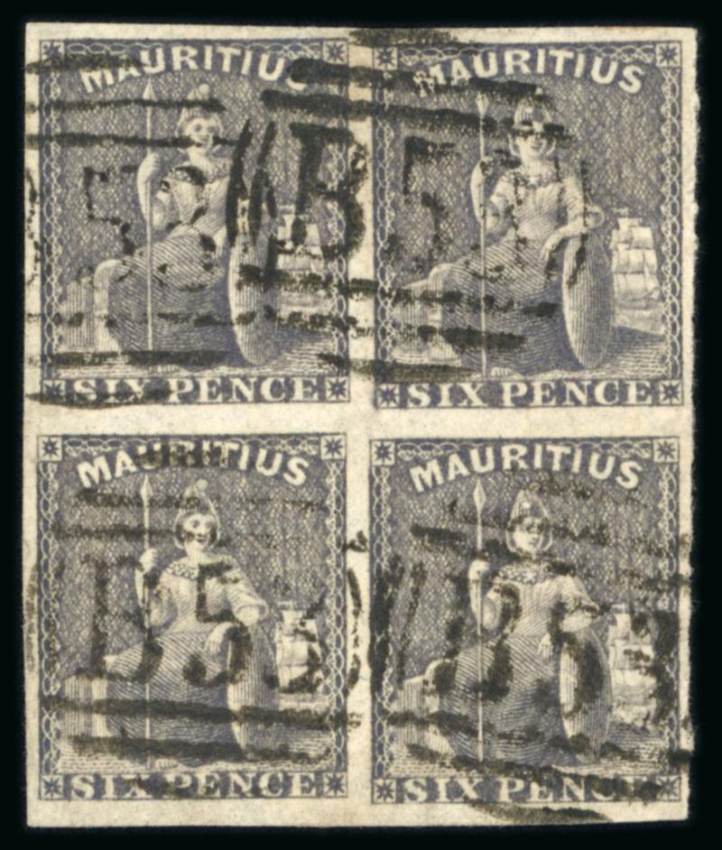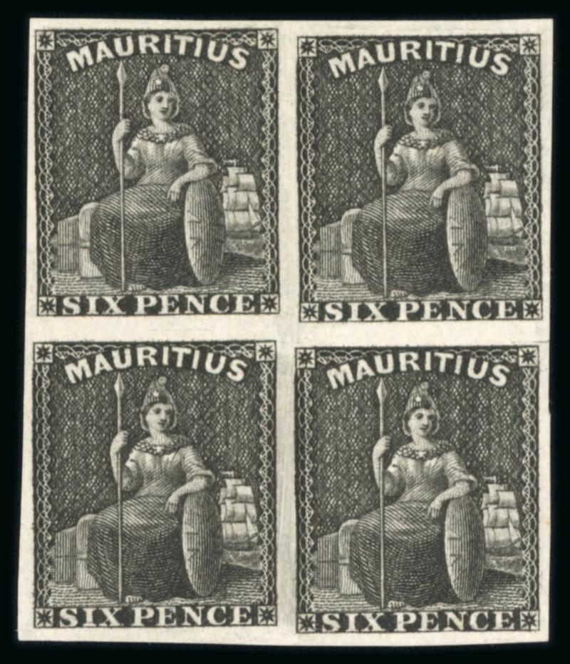 1858-62 Un-denominated Issue (9d.) dull magenta marginal block of four from the right of the sheet, unused without gum as usually found, lovely deep fresh colour. A rare and stunning multiple of this lovely stamp; ex "Port Louis" (S.G.29, £2'700 as singles) (Image)