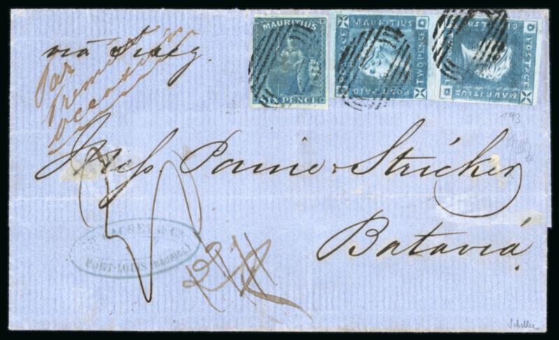 2d deep blue, early impression, two examples (pos. 6 and 8) both with clear to large margins in combination with Britannia 6d, just shaved at top left, all tied by void barred ovals to wrapper sent to Netherlands Indies, reverse with sender's commercial cachet, GPO Mauritius despatch, Madras and Singapore transits, very fine, the best Lapirot-Britannia mixed franking and one of only two to the Netherlands Indies; cert. Brandon (2007) and Scheller (2024); ex A. J. Stevens and Davy. (Image)