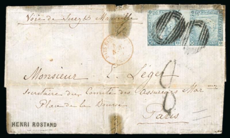 1859 entire from 'Boulanger Rostand', Port Louis to Paris franked pair 2d tied by two black oval bars, endorsed "Voie de Suez", '8' decimes charge and red transit cds, Marseille A Paris tpo on reverse, stamps without margins on three sides, vertical and horizontal creasing to entire and some heavy staining (Image)