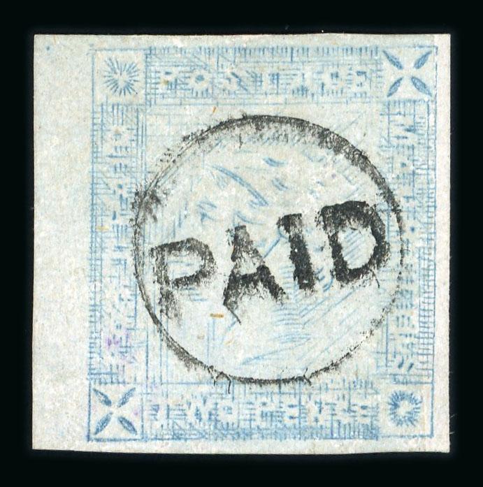 1848-1859 POST PAID 1d red on bluish paper, worn impression (pos. 9) cancelled by small neat 5-ring circular, small light thin in top right corner, otherwise fine. (Image)