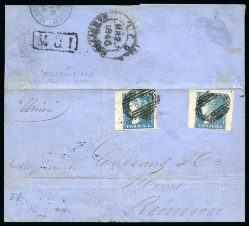 1859 Dardenne 2d. bright blue, two singles with clear to huge margins, from positions 18 & 4, on 1860 cover from Port Louis to Réunion, cancelled by dumb ovals in black, GPO MAURITIUS despatch for MR 23 1860 on flap, St. Denis arrival 29 Mars, and showing framed "M & I" (Mauritius and India) hs, fresh and attractive, a rare usage; ex Chartwell, Chand 2002 (Exhibited at British Library), "Port Louis"; cert. BPA (2012). (Image)