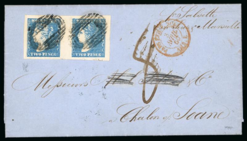 2d. pale blue horizontal pair, pos.25-26 (pos.26 showing hair retouch), fresh colour, wonderful wide margins, on entire letter to France, stamped by two clear and distinctive strikes of the void barred ovals, red French transit stamp 3 Apr adjacent, reverse with MAURITIUS MR 8 1860 departure and CHALON-S-SAÔNE 4 AVRIL 60 arrival cancellations, address partially crossed out. A very fine, rare and pristine cover; cert. BPA (2020); ex Hiroyuki Kanai (Feldman auction Nov. 1993, lot 243) (Image)