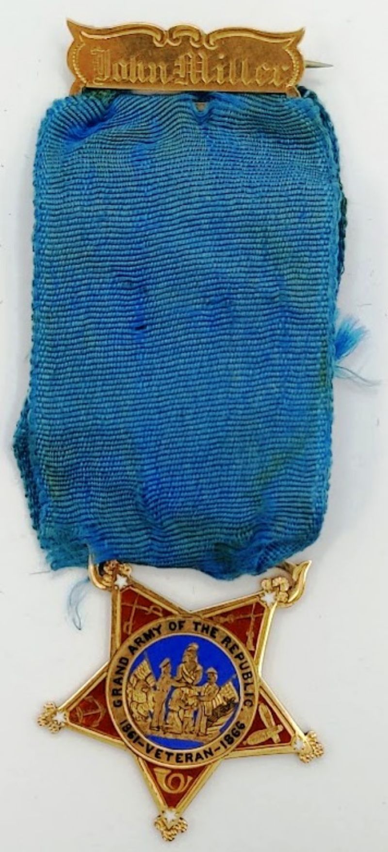 GAR (Grand Army of the Republic) veteran's gold service medallion (.209 ozt of 14k or 18k gold.) The inscription reads: "Presented to Comrade John Miller by Post No. 17 G.A.R. for 12 years gratuitous service as Quartermaster of The Post." Probably awarded about 1900 for service to a post with members comprised of Civil War veterans. We have not ascertained the fineness of the gold, but the medal likely contains between .123 ozt and .159 ozt of pure gold. The historical significance adds a marked premium. (Image)