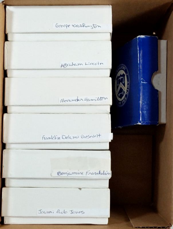Group (7) bronze medals produced by the U.S. Mint; all are 3" except for the 2 1/4" John Paul Jones; incl Benjamin Franklin, Alexander Hamilton, George Washington, Abraham Lincoln - Indian Peace medal, FDR and JFK Inaugural; ea in original packaging (Image)