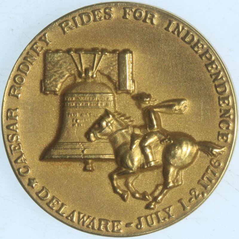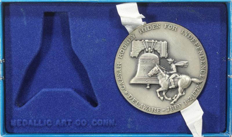 DELAWARE Official State of Delaware American Revolution Bicentennial medal, 2½" fine silver, numbered 113, made by Medallic Art Co., in original packaging w/ paper; obv w/ Liberty Bell and Caesar Rodney on horseback, rev w/ State Seal. (Image)