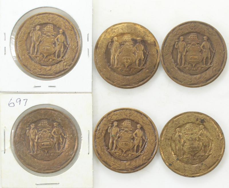 DELAWARE 1938 Tercentenary (6) examples of the smaller-size official bronze medal, obv ship Kalmar Nyckel and rev state arms, produced by Medallic Art Co. for the Delaware Tercentenary Commission and sold for 50¢ ea. (So-Called Dollar HK #697); a couple w/ aging, others AU (Image)