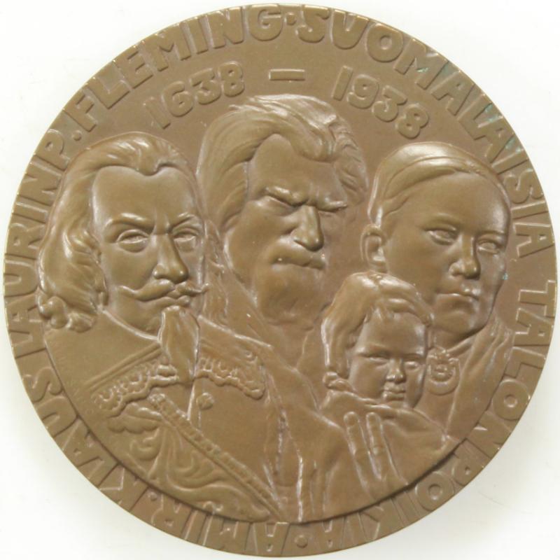 FINLAND 1938 Delaware Tercentenary Official medal, 56mm bronze, designed by Alpo Sailo, obv Capt Fleming and settler family, rev log church, stump and stack of sheaves; XF (Image)
