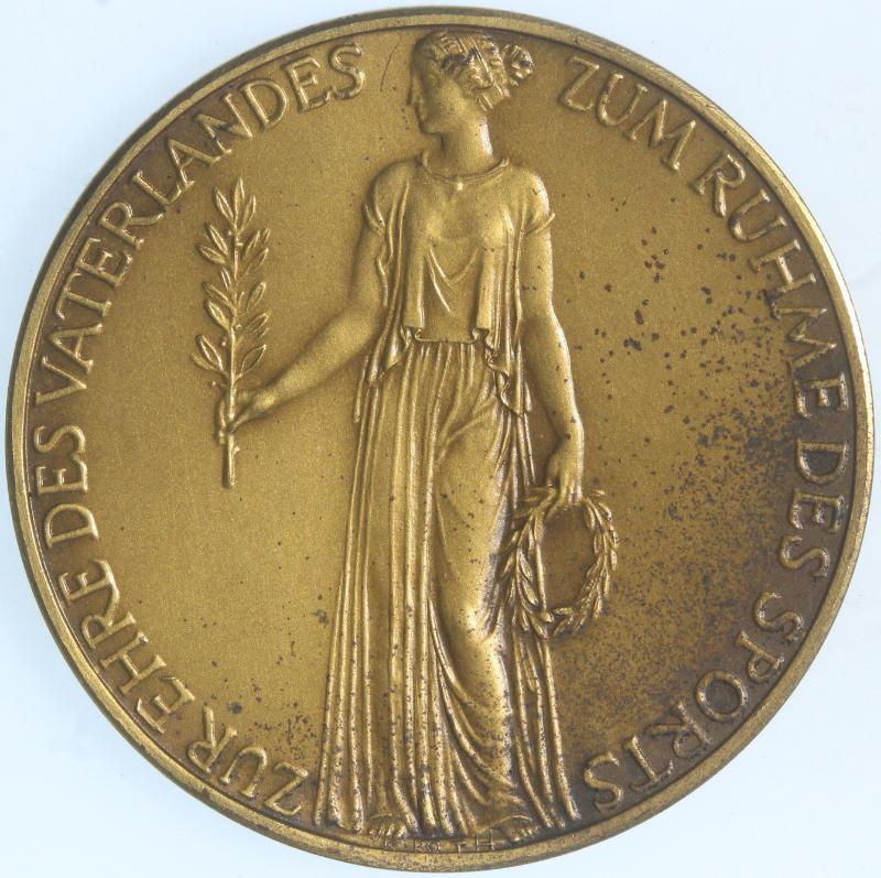 GERMANY 1936 Berlin Olympics souvenir medal, 38mm bronze, in small original box w/ "1936" and Olympic rings on lid; obv standing woman w/ branch & laurel "zur Ehre des Vaterlandes zum Ruhme des Sports"; rev w/ Olympic bell design and small swastika at bottom; XF (Image)