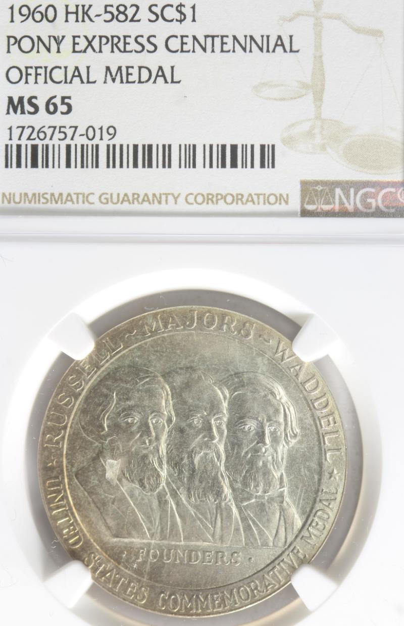 1960 Pony Express Centennial Official Medal in Silver NGC MS65. A "So-Called Dollar" Hibler/Kappen #582. Only 5,000 in silver were authorized - fewer were struck. The centennial of the Pony Express was a much heralded event in 1960. I doubt it would be as popular today. (Image)