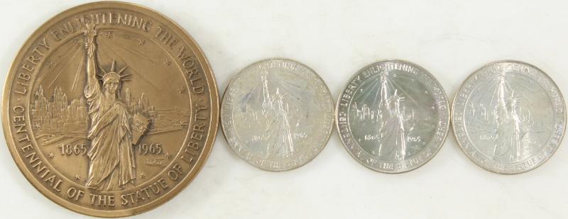 1965 (4) Federal Hall National Memorial medals, complete set of (3) silver medals, each 33.8mm and 30 grams .900 silver, in original boxes w/ papers, only 5,000 of each produced (original cost $10 ea); designs 1-3 are by Gasparro: Federal Hall, American Museum of Immigration and Castle Clinton; additional bronze medal of the Federal Hall design, 64mm marked Medallic Art Co. (Image)