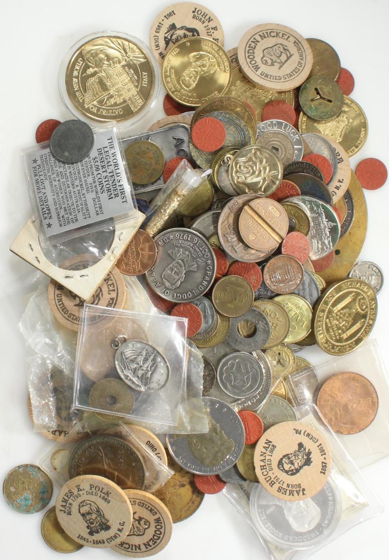 Mystery lot of tokens & medals of all kinds; large size medals incl Medallic Art "The Magi," Pope's 1965 visit to UN, Israel Discount Bank and Israel state medal 1980 Jabotinsky; others are small to medium sized items on American presidents & history, wooden nickels, (4) gold-plated replicas of 1933 Double Eagle, Chrysler Corp SILVER medal for Bill of Rights, 1998 medal for 750th anniv Cologne Cathedral, altered & replica coins, transport tokens, OPA wafers, casino and many other kinds; VF to Unc (Image)