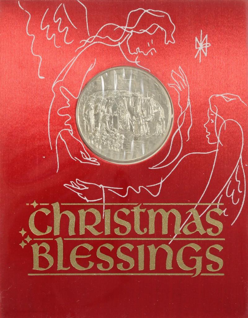 Franklin Mint Holiday Medals (9), 39mm sterling silver in original holders, 1968 set of (3) in special folio, others in plastic holders, incl dove of peace 1971-72, 1976, manger scene 1976, Hanukkah 1976 and toy shop 1976; approx 6.2 oz ASW (Image)
