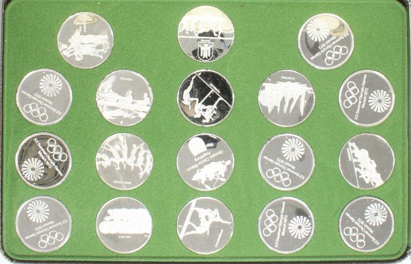 1972 Munich Olympics complete set of (18) 32mm sterling silver proofs (11 ozt ASW); one for Munich, others for various sports; in original box (no papers) and all still quite shiny (Image)