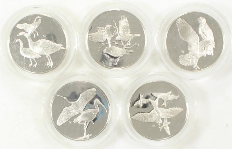 Selection Franklin Mint sterling silver medals; Robert's Birds #46-50 (10.4 oz ASW); (5) Holiday medals 1978-81 & 1991 Peace on Earth in original holders (approx 4.2 oz ASW) (Image)