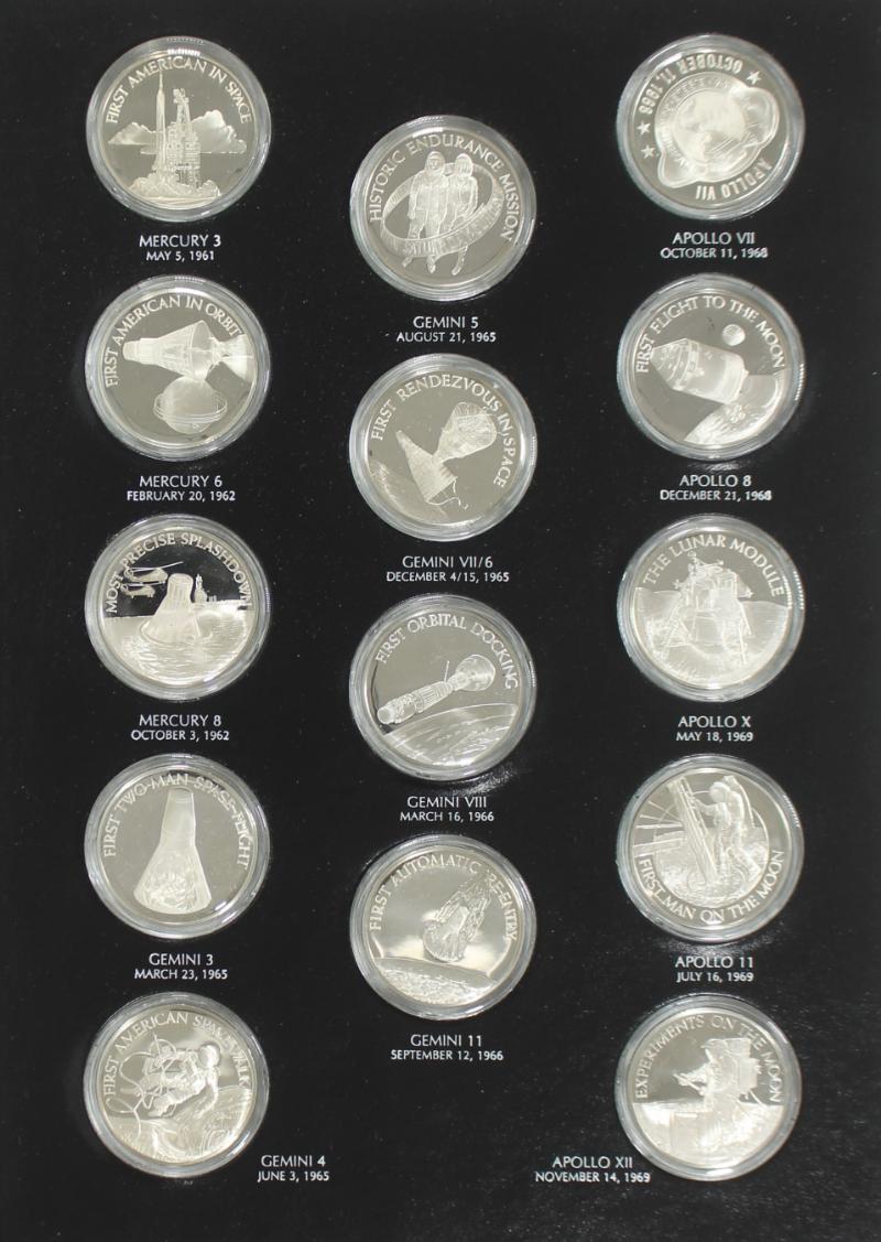1985 The Official American Space Flight Silver Anniversary Medals set of (25) sterling silver proofs (approx 20 oz ASW), in Franklin Mint folder w/ papers, attractive set (Image)