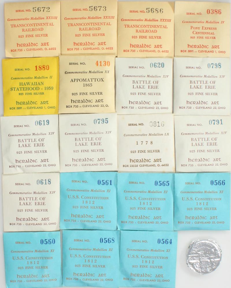 Stock of (20) silver medallions produced by Heraldic Art of Cleveland, Ohio, half-dollar sized sterling silver, honoring various themes of American history & culture; a complete set of (60) is difficult to find; each in original small paper flip w/ random serial numbers; incl #2 Hawaiian Statehood; #4 Pony Express Centennial; #11 U.S.S. Constitution (6), #14 Battle of Lake Erie (6); #20 Appomattox; #33 Transcontinental Railroad (4, one w/o outer envelope); #60 1778; each wrapped in plastic or foil as sold, likely all MS, popular topics [n.b. this is the final batch of these medallions from this estate] (Image)