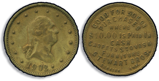 1908 50¢ Stewart Brothers,Token, copper, 32mm diameter, obverse: 15 stars around edge with bust of George Washington in center and "1908" at bottom; reverse: "GOOD FOR 50¢ ON/PURCHASES/WHERE/$10.00 IS PAID IN/CASH/CARPETS STOVES &/FURNITURE/STEWART BROS./DUNKIRK IND." XF (Image)