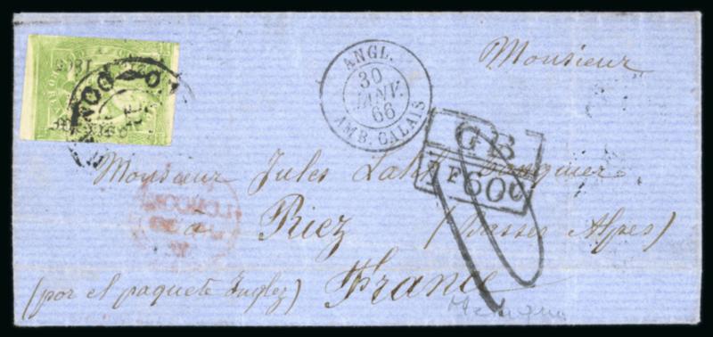 1865 entire to Riez, France bearing single franking 4r Imperial Eagle overprinted 'Mexico, 213 -1865' at sides, two fine margins but none at sides tied double-ring unclear cds, GB/1f60c accountancy handstamp and red London transit on reverse, French entry cds of same date on front and rated '10' decimes, arrival backstamp; a scarce overseas usage for this issue. (Image)