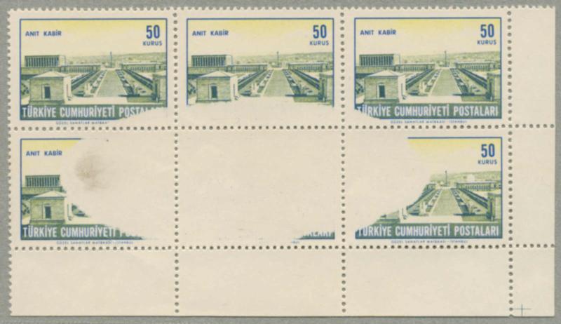 1963, 50 k., blue and yellow, block of (6), bottom right margin piece, enormous elliptic offset (!), MNH, XF! Estimate 400€.