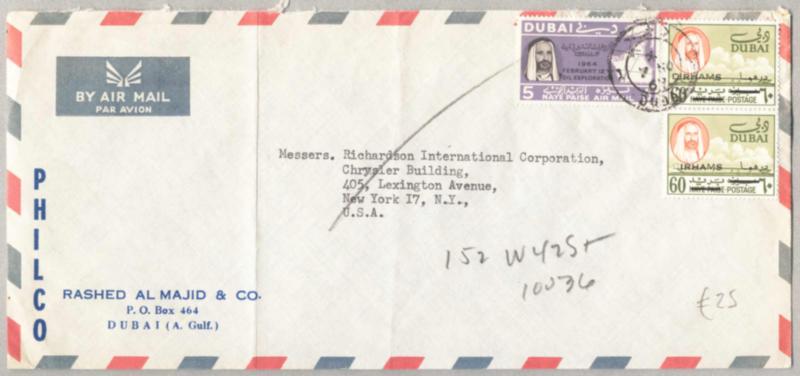 1967, 5 n.p. + 60 d on 60 n.p. (2), on Air Mail cover from DUBAI to NEW YORK/USA, tied with black 7 NO 67 DUBAI, pencil mark on front, reverse with arrival cancel NEW YORK, NY, NOV 13 1967, fresh and desirable letter in perfect condition, XF! Estimate 200€.