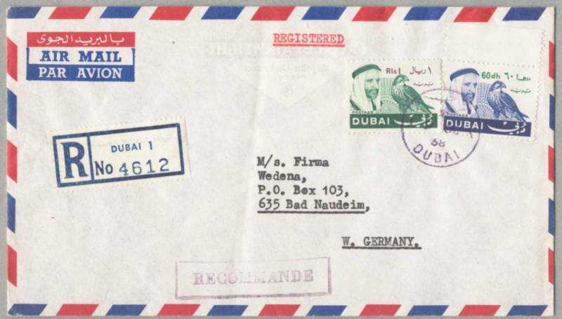 1968, 60 d. + 1 r., (2), on registered Airmail cover from DUBAI to BAD NAUDEIM/BRD with R label DUBAI 1 and number, tied with 19 OC 68 DUBAI and boxed RECOMMANDE handstamp, exceedingly fresh, XF! Estimate 300€.