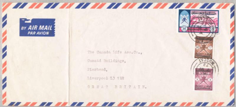 1972, 5 b. + 10 b. + 50 b., on Air Mail cover from MUSCAT/Oman to LIVERPOOL/GB, tied with MUSCAT 2 MY 72, flap of envelope is missing, still a fresh letter, VF-XF! Estimate 300€.
